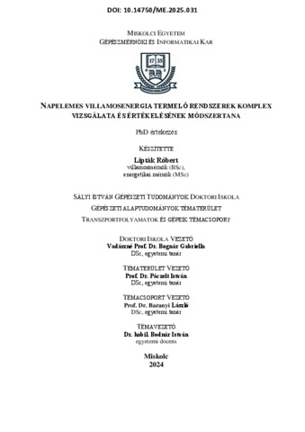 Lipták, Róbert (2025) Napelemes villamosenergia termelő rendszerek komplex vizsgálata és értékelésének módszertana. PhD thesis, Miskolci Egyetem.
