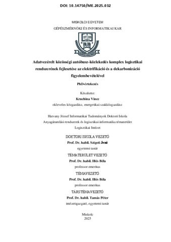 Kruchina, Vince (2025) Adatvezérelt közösségi autóbusz-közlekedés komplex logisztikai rendszerének fejlesztése az elektrifikáció és a dekarbonizáció figyelembevételével. PhD thesis, Miskolci Egyetem.