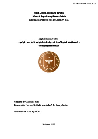 Gyarmathy, Judit (2025) Digitális korszakváltás : A polgári pervitel és a digitalizáció alapvető összefüggései, kitekintéssel a veszélyhelyzet hatásaira. PhD thesis, Károli Gáspár Református Egyetem.