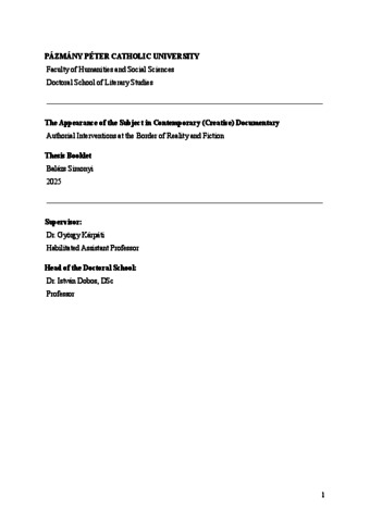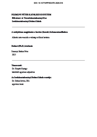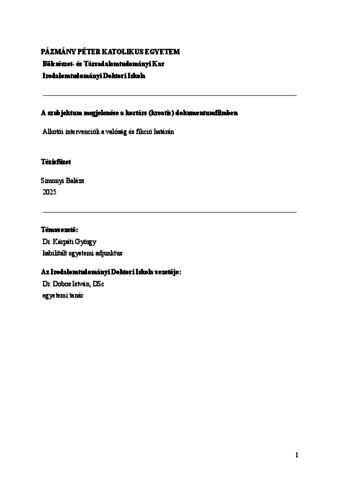 Simonyi, Balázs Péter (2025) A szubjektum megjelenése a kortárs (kreatív) dokumentumfilmben : Alkotói intervenciók a valóság és fikció határán. PhD thesis, Pázmány Péter Katolikus Egyetem.