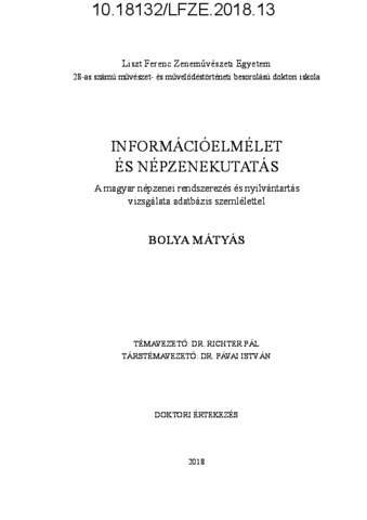 Bolya, Mátyás (2018) Információelmélet és népzenekutatás : A magyar népzenei rendszerezés és nyilvántartás vizsgálata adatbázis szemlélettel. PhD thesis, Liszt Ferenc Zeneművészeti Egyetem.