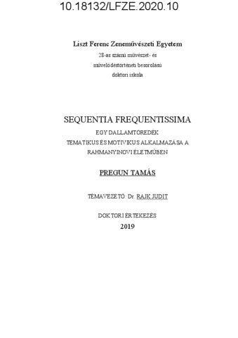 Pregun, Tamás (2020) Sequentia Frequentissima : Egy dallamtöredék tematikus és motivikus alkalmazása a Rahmanyinovi életműben. PhD thesis, Liszt Ferenc Zeneművészeti Egyetem.