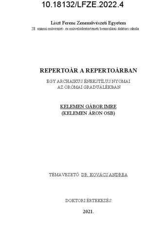 Kelemen, Gábor Imre (2022) Repertoár a repertoárban : Egy archaikus énekstílus nyomai az órómai graduálékban. PhD thesis, Liszt Ferenc Zeneművészeti Egyetem.