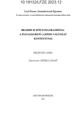 Belinszky, Anna (2023) Brahms H-dúr zongoratriója: A fiatalkori és a kései változat kontextusai. PhD thesis, Liszt Ferenc Zeneművészeti Egyetem.