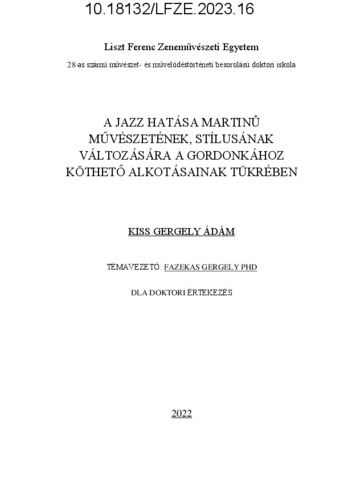 Kiss, Gergely Ádám (2023) A jazz hatása Martinů művészetének, stílusának változására a gordonkához köthető alkotásainak tükrében. PhD thesis, Liszt Ferenc Zeneművészeti Egyetem.