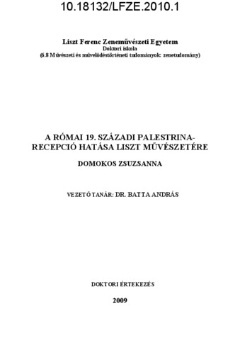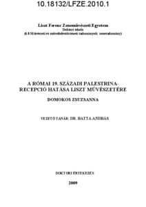 Domokos, Zsuzsanna (2010) A római 19. századi Palestrina-recepció hatása Liszt művészetére. PhD thesis, Liszt Ferenc Zeneművészeti Egyetem.