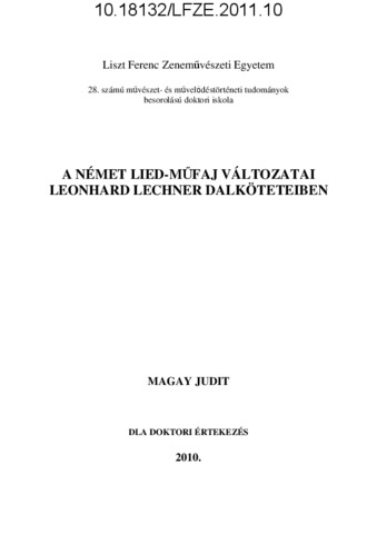 Magay, Judit (2011) A német Lied-műfaj változatai Leonhard Lechner dalköteteiben. PhD thesis, Liszt Ferenc Zeneművészeti Egyetem.