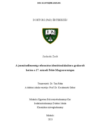 Szolnoki, Zsolt (2025) A jezsuitaellenesség református identitásalakulásra gyakorolt hatása a 17. századi Felső-Magyarországon. PhD thesis, Miskolci Egyetem.