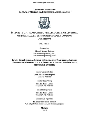 Dakhel, Ahmad Yasser (2025) Integrity of Transporting Pipeline Girth Welds Based on Full-Scale Tests Under Complex Loading Conditions. PhD thesis, Miskolci Egyetem.