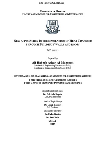 Ali Habeeb Askar, Al-Magsoosi (2025) New Approaches in the Simulation of Heat Transfer through Buildings' Walls and Roofs. PhD thesis, Miskolci Egyetem.