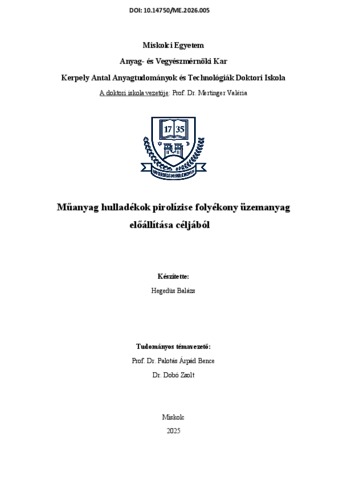 Hegedüs, Balázs (2026) Műanyag hulladékok pirolízise folyékony üzemanyag előállítása céljából. PhD thesis, Miskolci Egyetem.