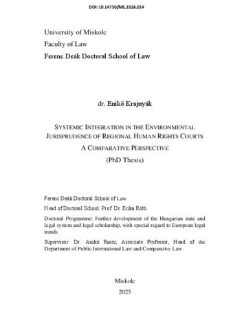 Krajnyák, Enikő (2026) Systemic Integration in the Environmental Jurisprudence of Regional Human Rights Courts : A Comparative Perspective. PhD thesis, Miskolci Egyetem.