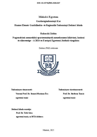 Rakaczki, Zoltán (2026) Nagyszabású nemzetközi sportesemények menedzsment kihívásai, hatásai és sikeressége : A 2024-es Európai Egyetemi Játékok vizsgálata. PhD thesis, Miskolci Egyetem.