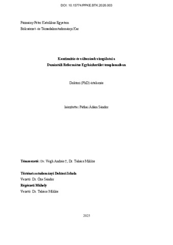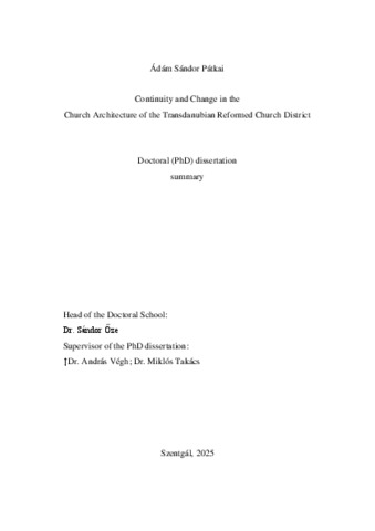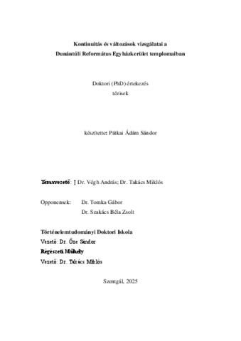Pátkai, Ádám Sándor (2026) Kontinuitás és változások vizsgálatai a Dunántúli Református Egyházkerület templomaiban. PhD thesis, Pázmány Péter Katolikus Egyetem.
